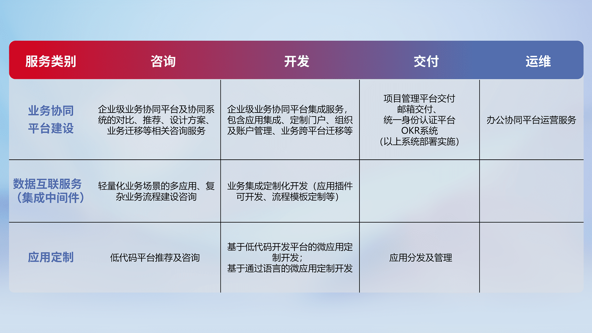 针对钉钉、、、、企微、、、、IDaas等平台级产品提供产品的规划、、、方案、、交付、、、定制化开发等服务,,实现如统一协同办公、、、、智能客户服务、、、混合会议管理、、、、智能数据查询、、、等业务场景,,,,实现数字化转型。。
